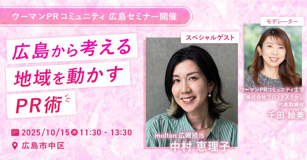 フロントステージが運営する「ウーマンPRコミュニティ」が、広島キックオフセミナーをモルテン広報 中村恵理子氏氏をゲストとしてお招きし、開催します。