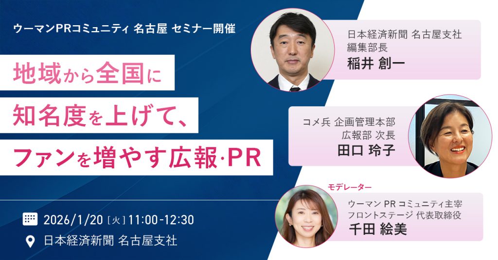 フロントステージが運営する「ウーマンPRコミュニティ」が、名古屋セミナーを日本経済新聞名古屋 編集部長 稲井創一氏と、コメ兵広報部 次長 田口玲子氏をゲストとしてお招きし、開催します。